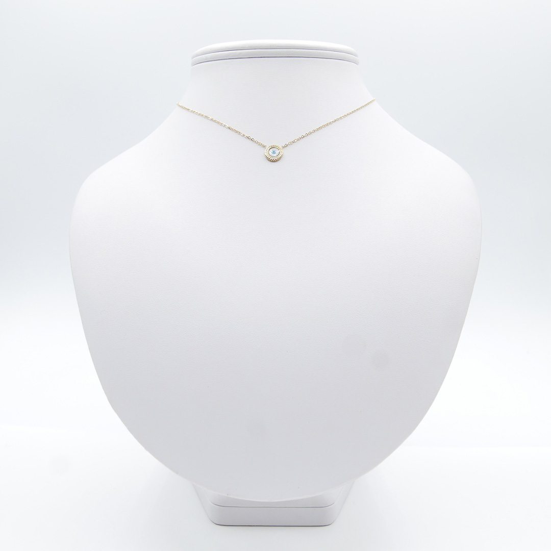 Collier en acier doré inoxydable composé d’une fine chaine dorée et d’un pendentif rond finement gravé serti d’un oeil porte bonheur.